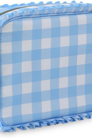 Gingham Ruffle Makeup Bag,Large Travel Cute Cosmetic Bag for Women Girls,Toiletry Bag Make up Organizer 11.8 x 4.7 x 9 inch (Blue Gingham)